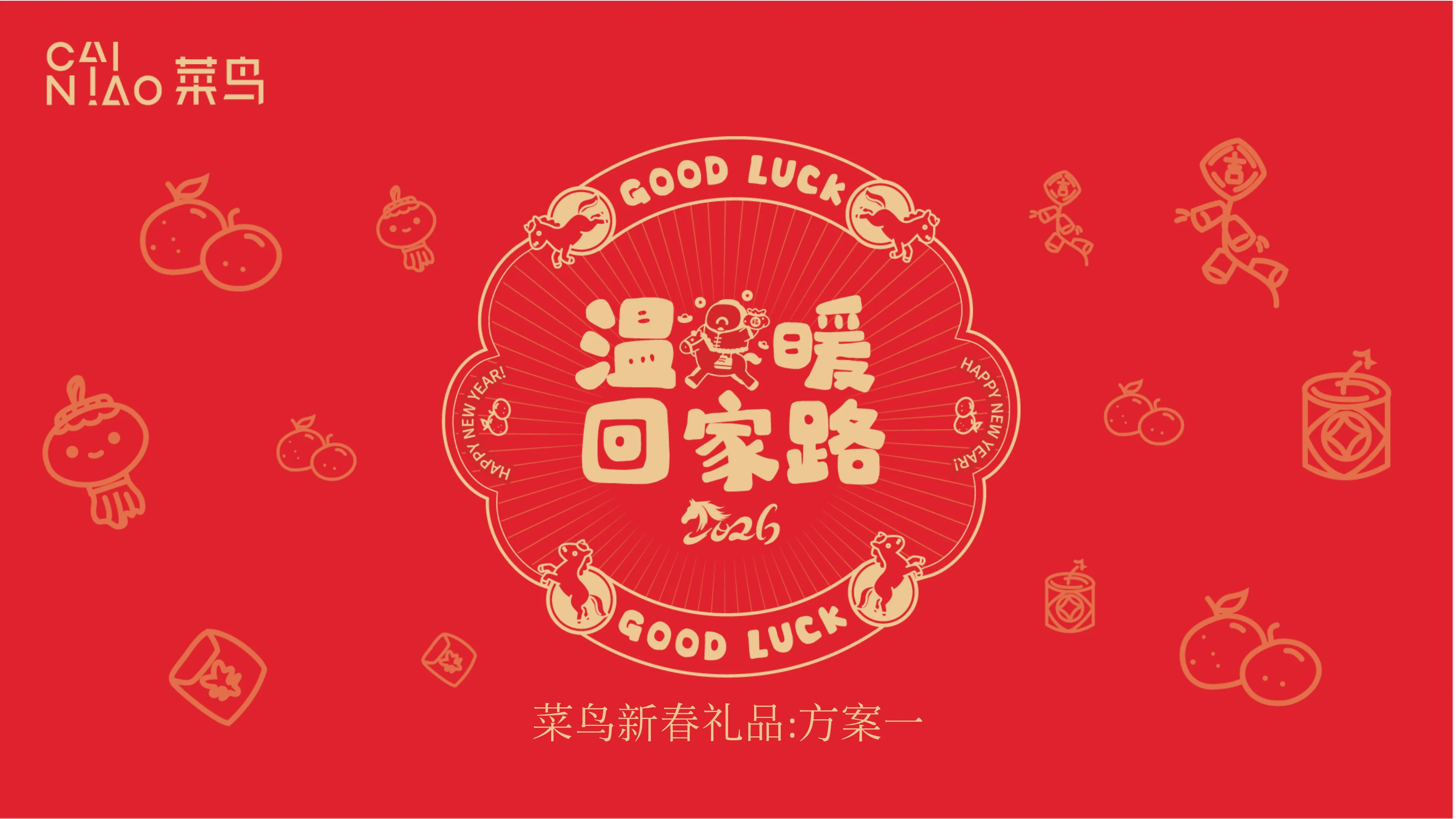为菜鸟网络设计的 2026 丙午马年“温暖回家路”新春礼包,包含两套完整提案。方案一聚焦于“时来运转”的互动结构,方案二强调“马上都有”的美好寓意。设计涵盖礼盒、礼袋、红包、对联及创意公仔。