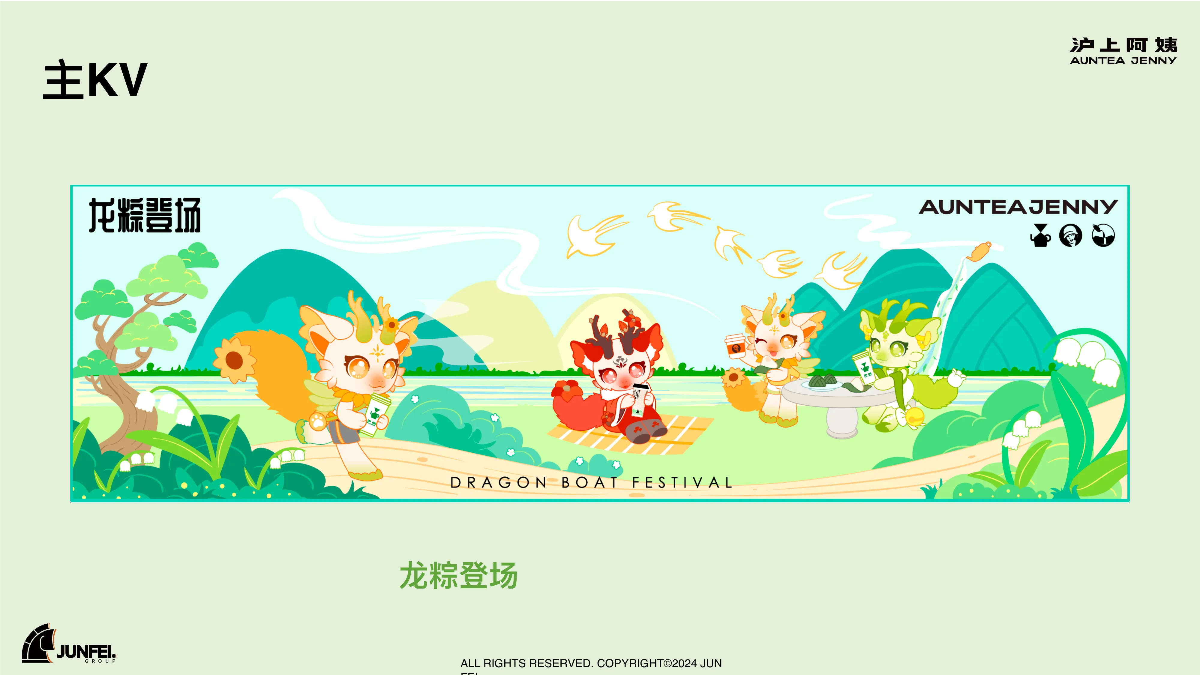 沪上阿姨端午节大型营销 Campaign “与粽不同”。包含 Slogan 创意、IP 形象“花与龙”的结合设计,以及 Plan A (时尚棋盘格) 和 Plan B (龙粽登场插画) 两套完整视觉方案及丰富的周边衍生品。