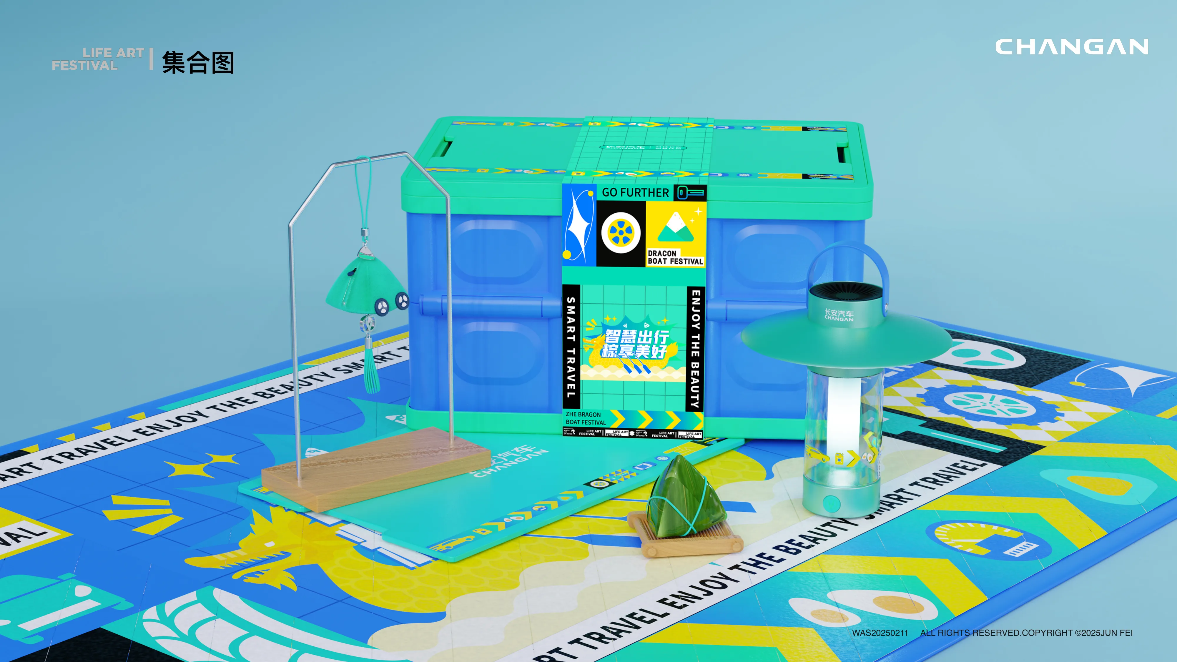 为长安汽车生活艺术节设计的端午主题周边系列。“粽享美好”系列聚焦户外露营场景,“粽有乾坤”系列聚焦车内智慧出行场景。