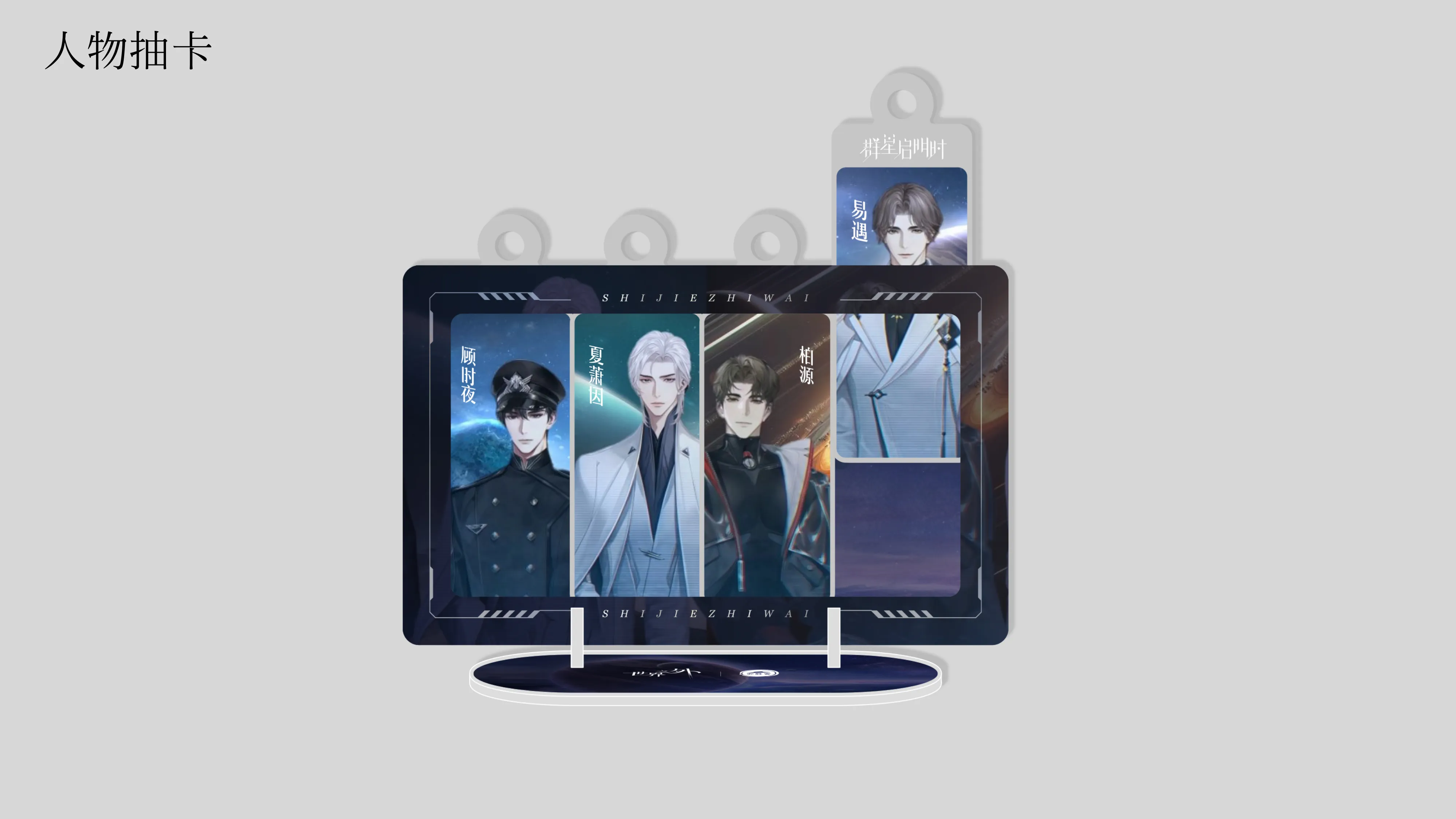 为游戏《重写宇宙》设计的全套角色周边。涵盖了从常规的吧唧(徽章)、镭射票到更具互动性的亚克力摇摇乐、故事抱枕等多种品类。
