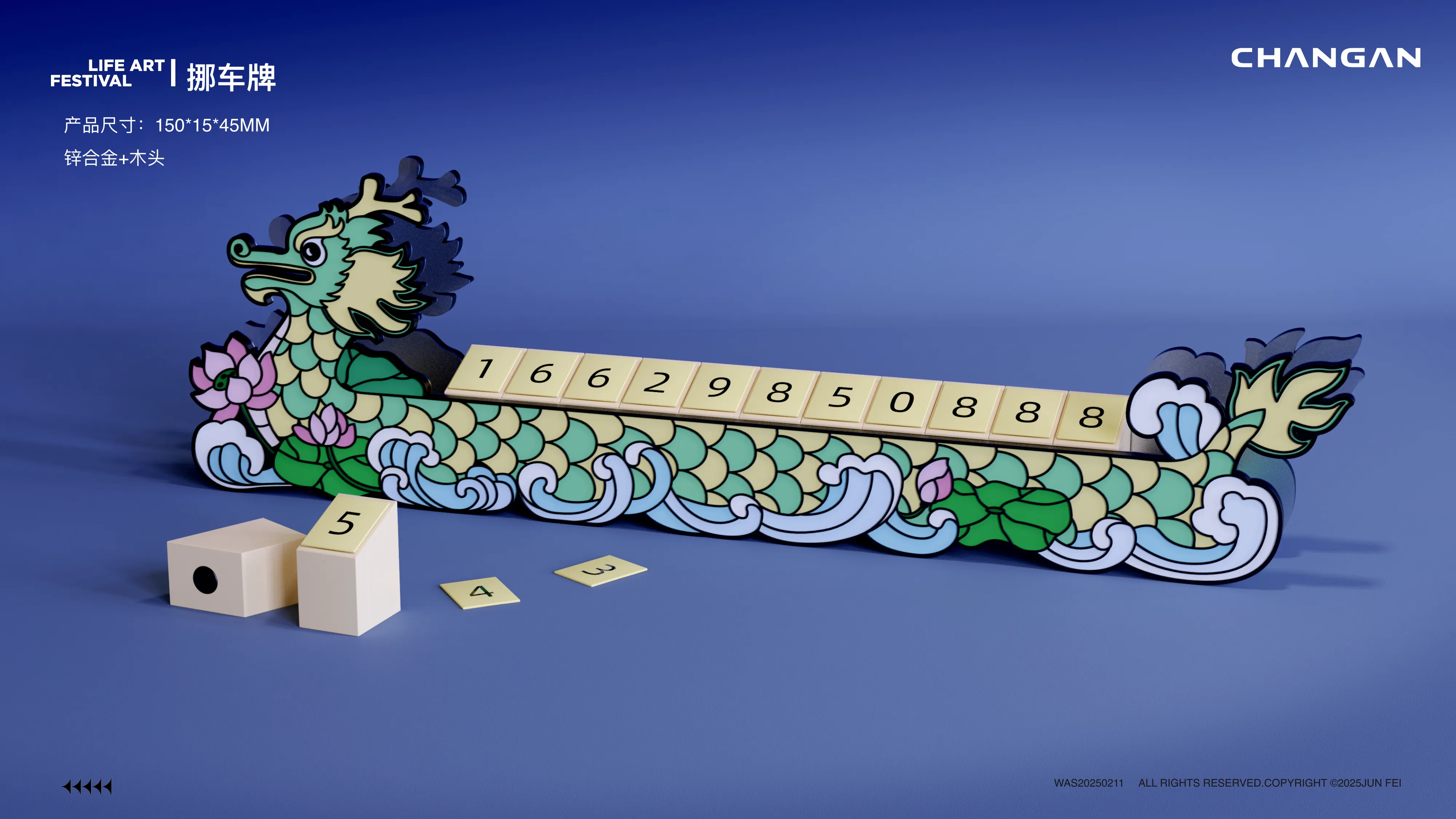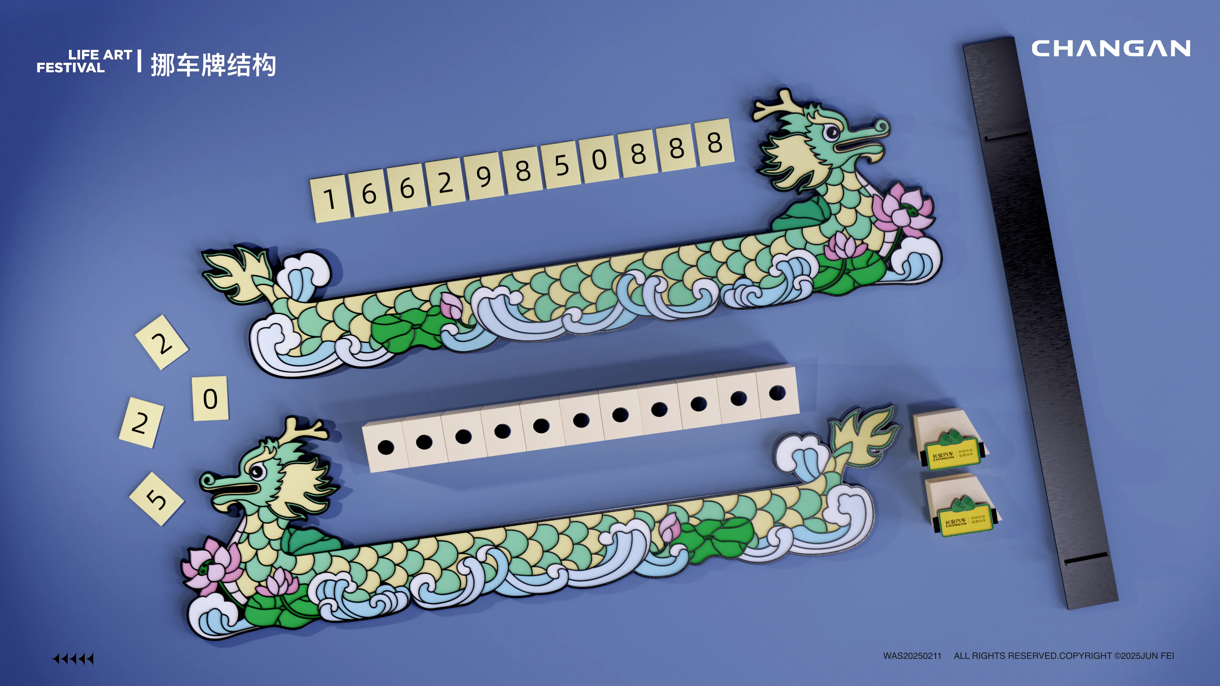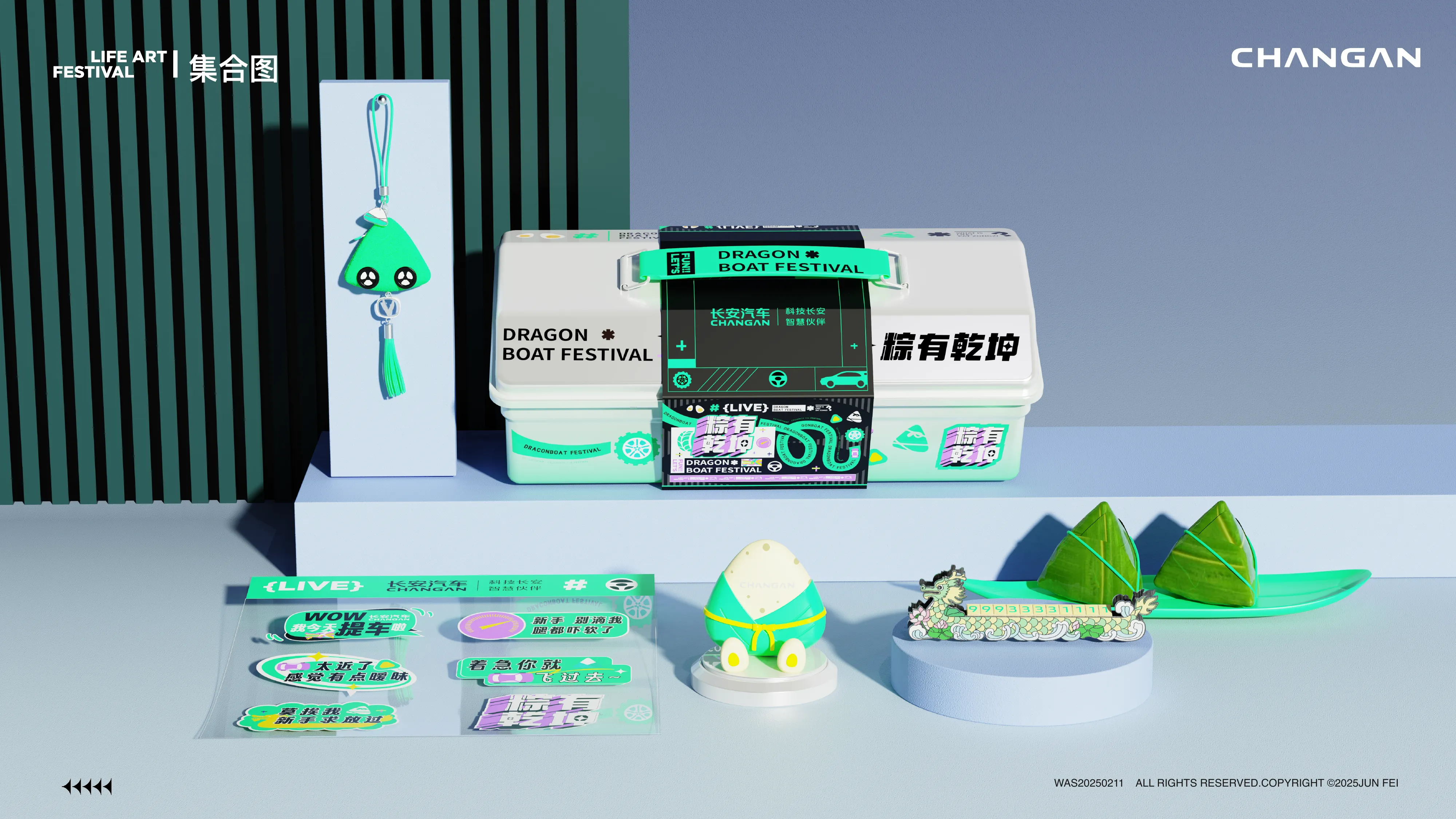 针对车内场景,设计了挪车牌、手机支架、万年历等用品。风格上偏向“科技潮酷”,运用银色金属质感与霓虹绿撞色,体现长安汽车的科技属性。特别是龙舟造型的挪车牌与万年历,将传统元素进行了现代化的工业风重构。