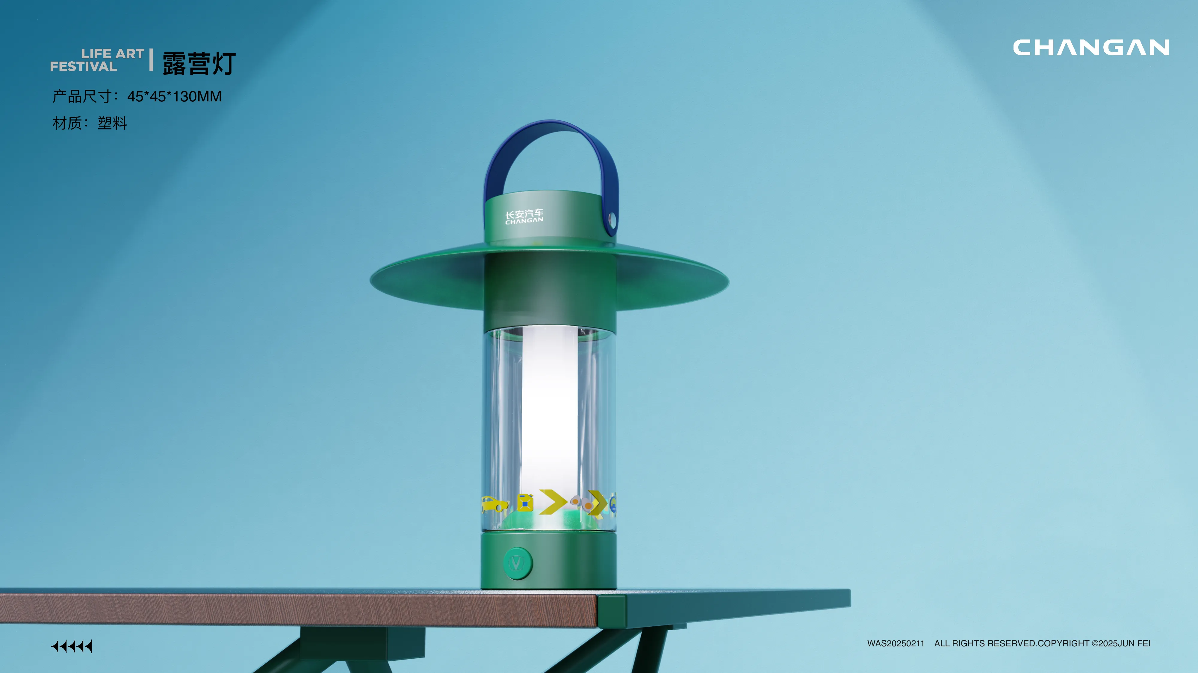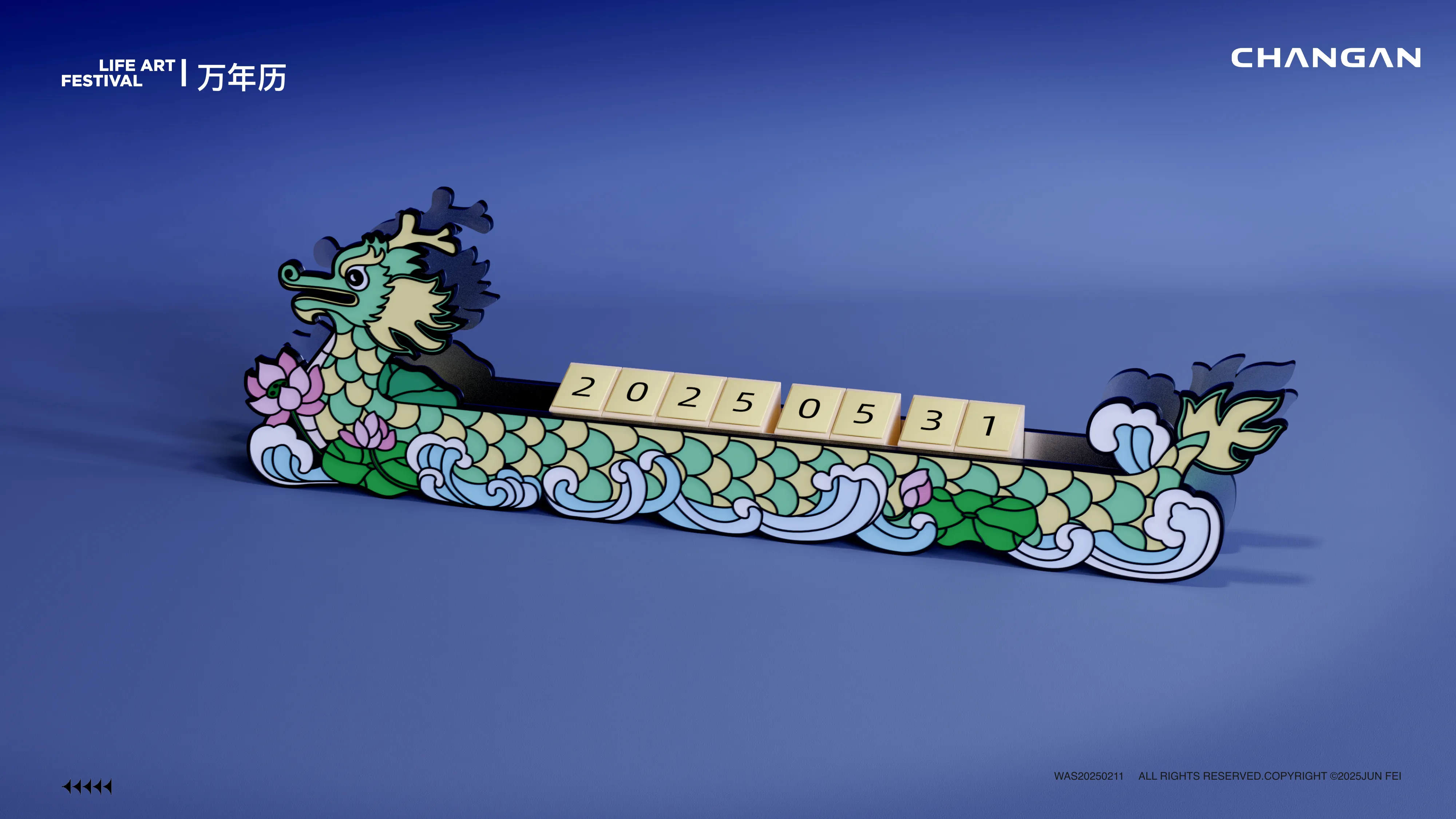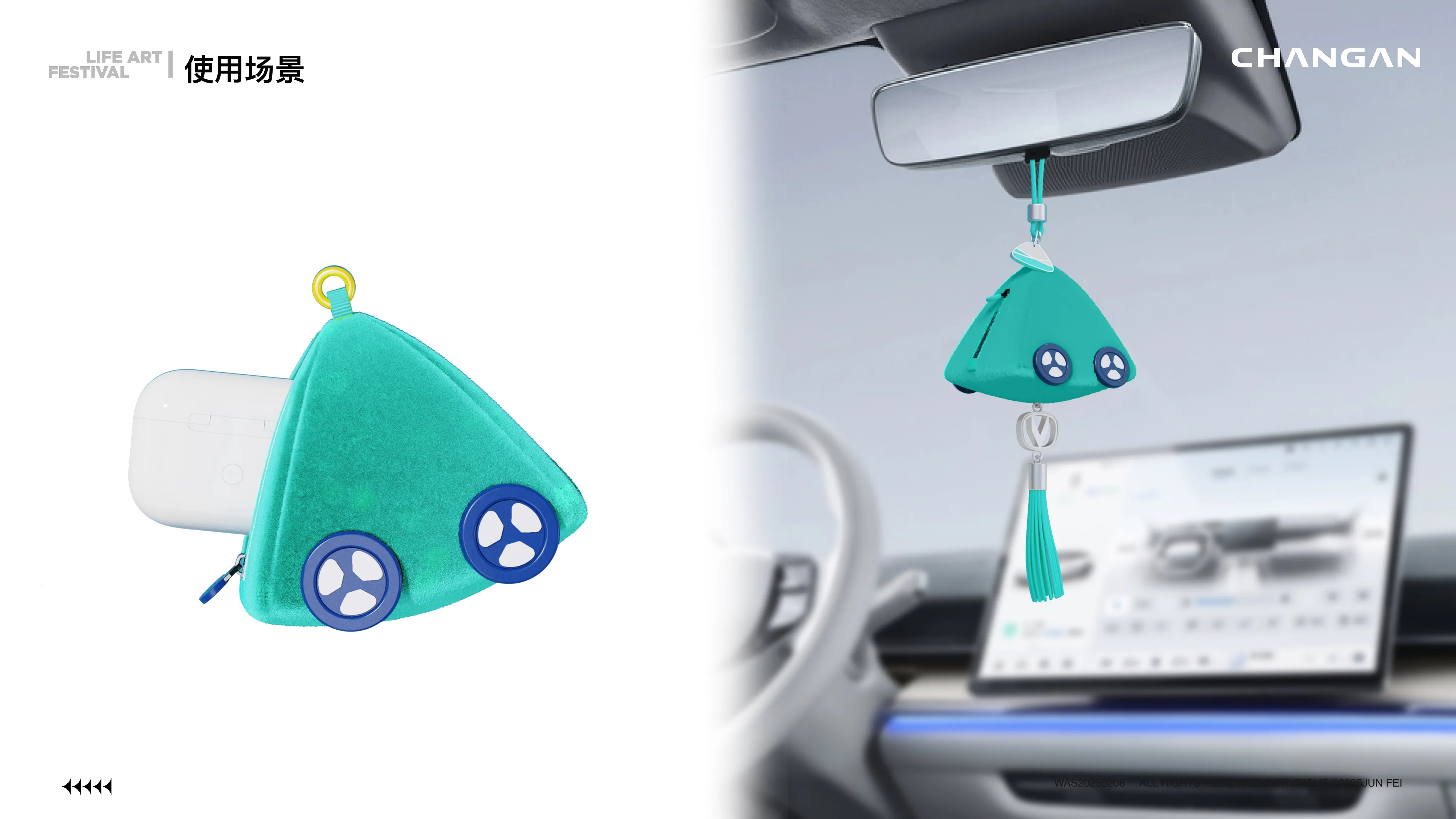 针对车内场景,设计了挪车牌、手机支架、万年历等用品。风格上偏向“科技潮酷”,运用银色金属质感与霓虹绿撞色,体现长安汽车的科技属性。特别是龙舟造型的挪车牌与万年历,将传统元素进行了现代化的工业风重构。